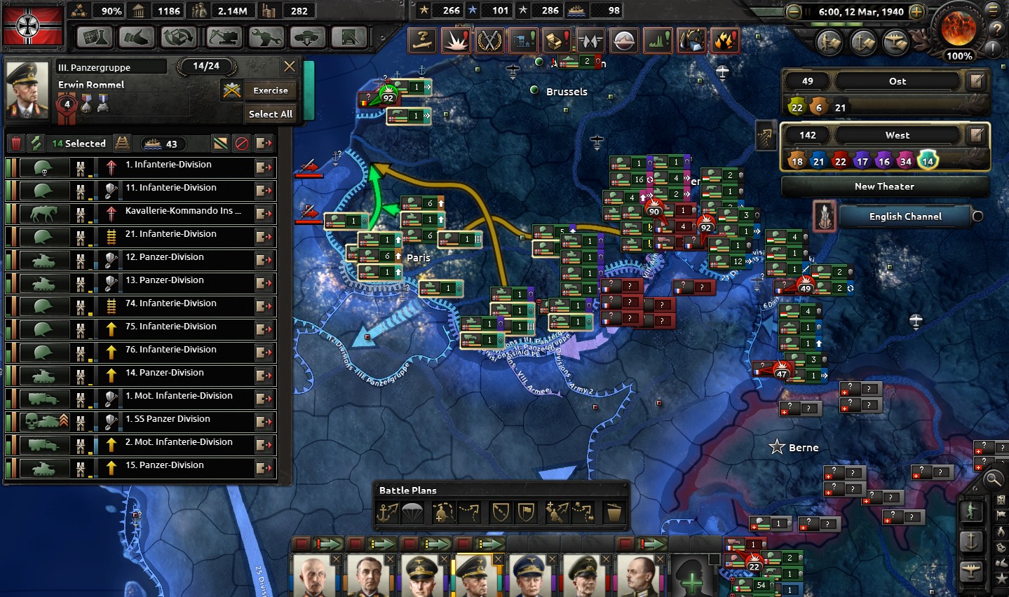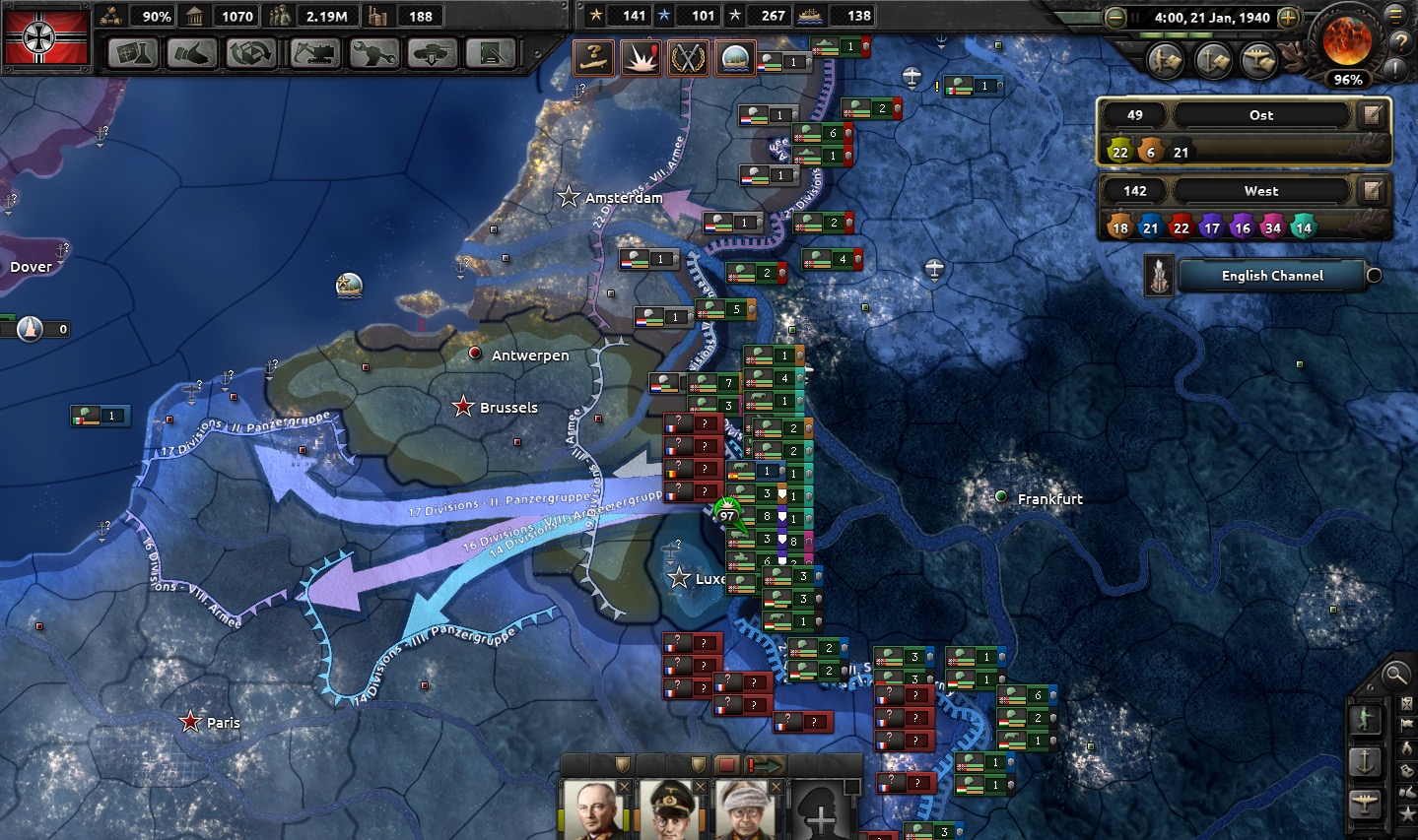 All three panzer groups will drive westward, making their breakthrough just north of Luxembourg and well clear of the Maginot Line. Manstein (II. Panzergruppe) will wheel north once it crosses into France, and drive to the sea at Dunkirk; Guderian (I. Panzergruppe) will continue straight west and threaten Paris to provoke a French reaction there; and Rommel (III. Panzergruppe) will wheel south. My sense is that the British and French will not end up deploying the bulk of their forces forward in the Low Countries but will instead try to keep themselves to the east and south of us. They can only really do this by pulling units off of the Maginot Line and the Italian front, so we will keep those units busy with large-scale feint attacks along the German-French border. Meanwhile Rommel will wheel south, consolidate just east of Paris, then drive southeast in an attempt to create a massive encirclement in eastern France and bag the entire Maginot Line.