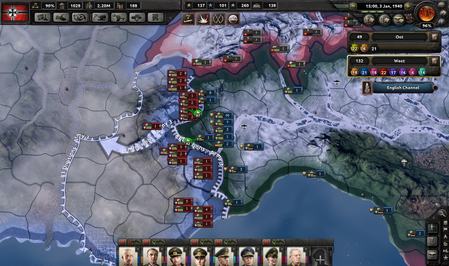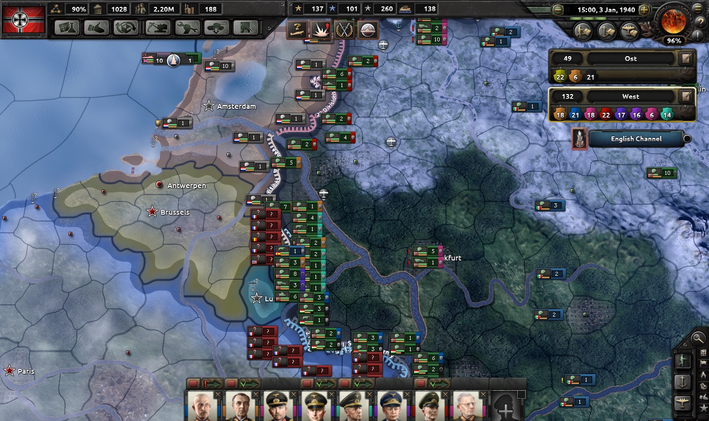 By start of 1940, the Allied air campaign has eased off a bit, allowing us to replenish the decimated Luftwaffe a bit. The good news is that the British seem to have also let off a bit, and are nowhere to be found either in the air over Germany or on the ground in the Low Countries or France.