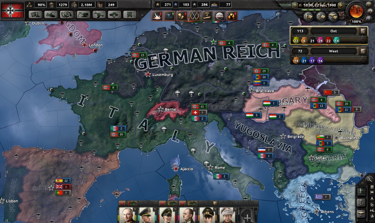 We are still in control of Paris and the low countries, but the bulk of French territory has been handed to Italy. This may also work to our advantage however: we have a far smaller amount of coastline to cover for protection from Allied seaborne invasion. There are already a decent number of cities in the Reich that have to be garrisoned due to unrest, and that combined with coastal protection requires a significant manpower commitment. We would like to have as many army assets available as possible for the coming campaign in the east.