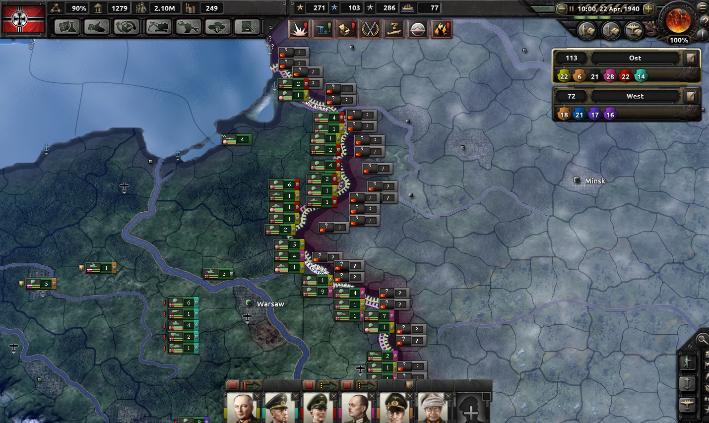 For now, we try and keep things quiet in the east by deterring the Russians. We need to buy ourselves another year, as OKH would like at least another panzer group and fifty new infantry divisions with which to start the invasion of Russia. We station 113 divisions on or near the eastern border, with 1st Panzer Group and its 17 divisions soon to join: