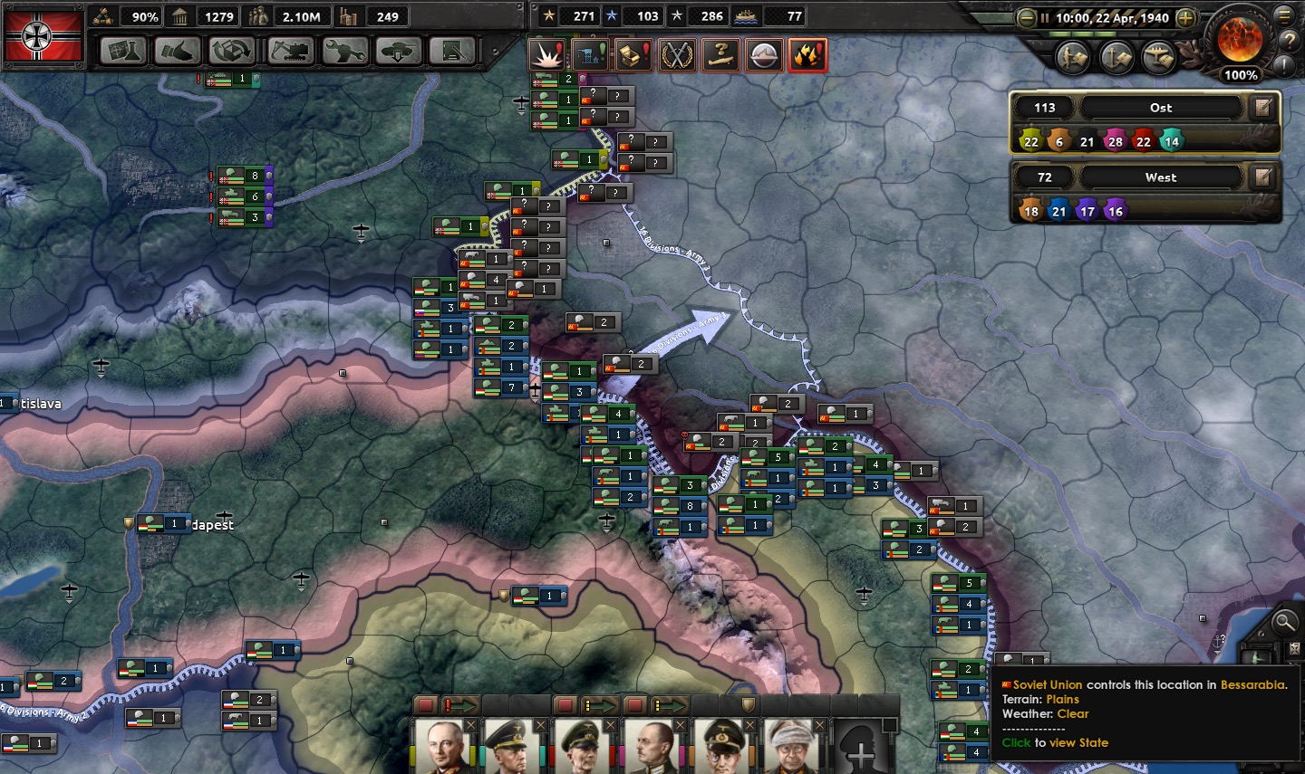 This section is a more complicated beast, both because the Carpathian Mountains are basically off-limits for mobile units, and most of the border is not within the Reich proper. We are allied with all three nations (Slovakia, Hungary, and Romania), and all three have territorial-dispute beef with the Soviets that they would like resolved. We will take advantage of this in enlisting their help. (You can see that the Hungarians have even already formalized their plans for retaking Bessarabia.)