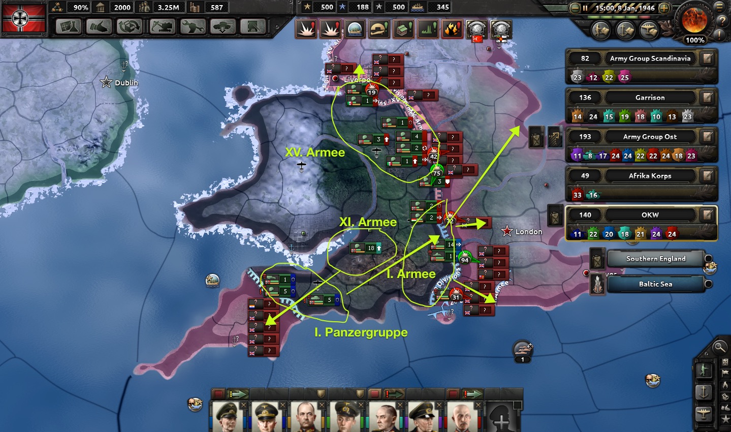 By January 8, OKW has reinforced by landing 11th Army at Bristol. This army will be responsible for the final push to Plymouth to eliminate all resistance in the Cornwall area. Meanwhile 15th and 1st Armies have done what they can in a broad-front advance, with surprising success: