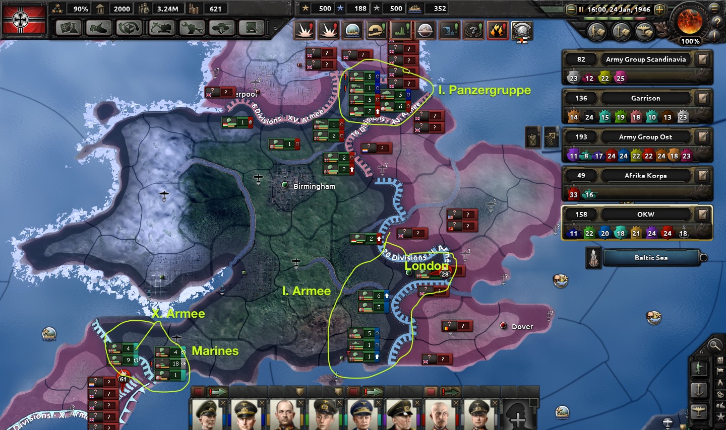 Birmingham is taken, and 1st Army now sits on the western outskirts of the London metro area. The prize for 15th Army is Liverpool, but early attempts to attack the city have been very costly.