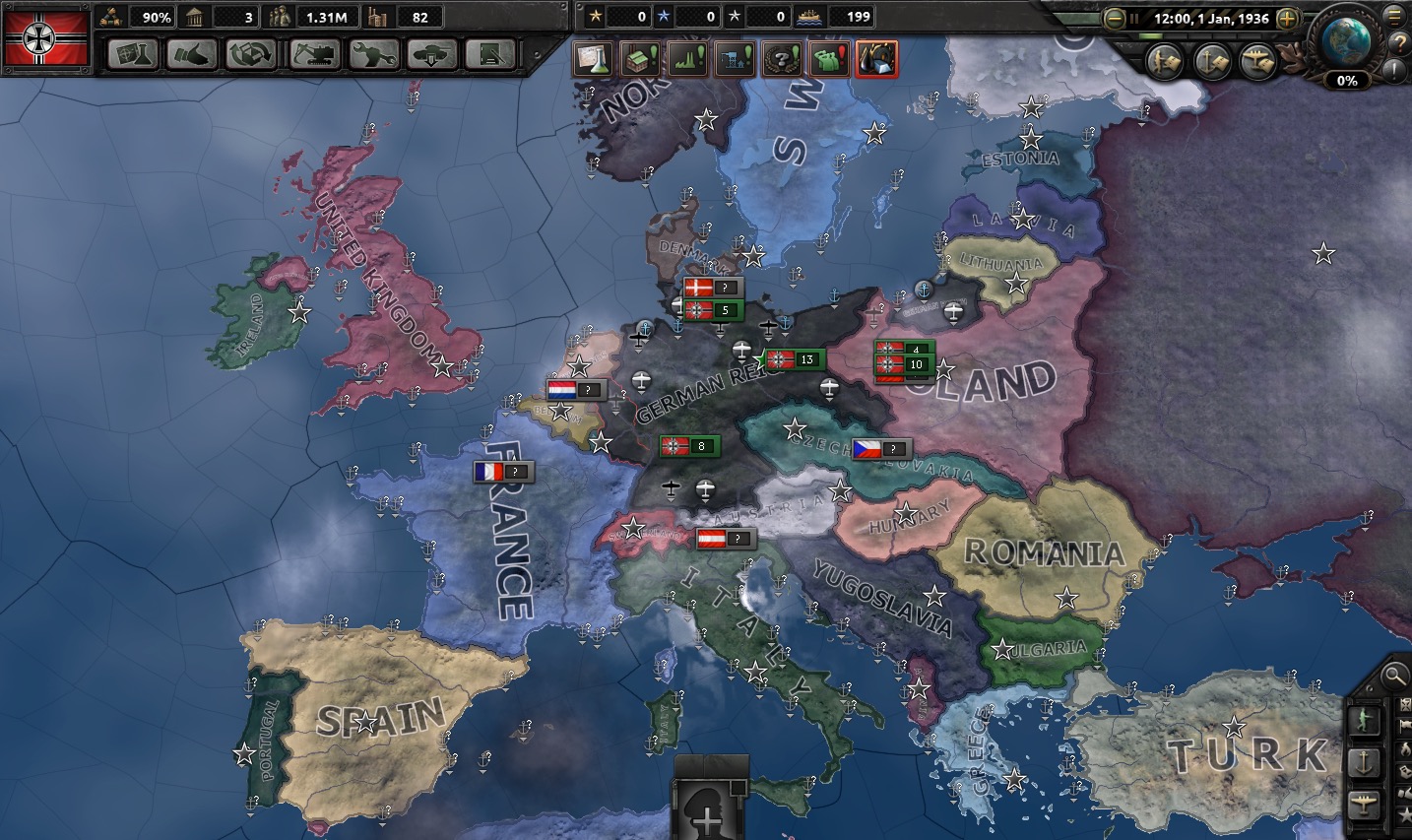 The game opens in January of 1936. The Reich starts on a decent economic footing, having emerged from the troubles of the post-World War I period. We have an adequate industrial base and a sizable manpower pool (1.31 million) with which to begin building up the Wehrmacht. As we are currently at peace, we are not currently on a war footing either in terms of conscription levels or use of civilian infrastructure -- so more resources will become available as we become more belligerent.