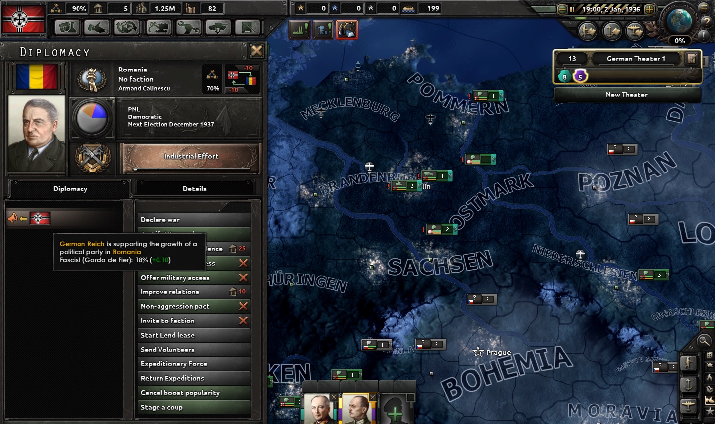 The screenshot above shows our master plan for long-term oil production: we will bring Romania into the Axis fold by increasing support there for the NSDAP political party. This has the effect of moving them toward the Axis faction. (Romania has large oil fields in the Ploesti region that we want.) The deal with the USSR is a temporary measure; we cannot rely on that long-term as we plan to invade them by 1941. Part of the motivation for that is the seizure of large oil fields in the Caucasus region, so if we succeed there we will be fully resource self-sufficient.