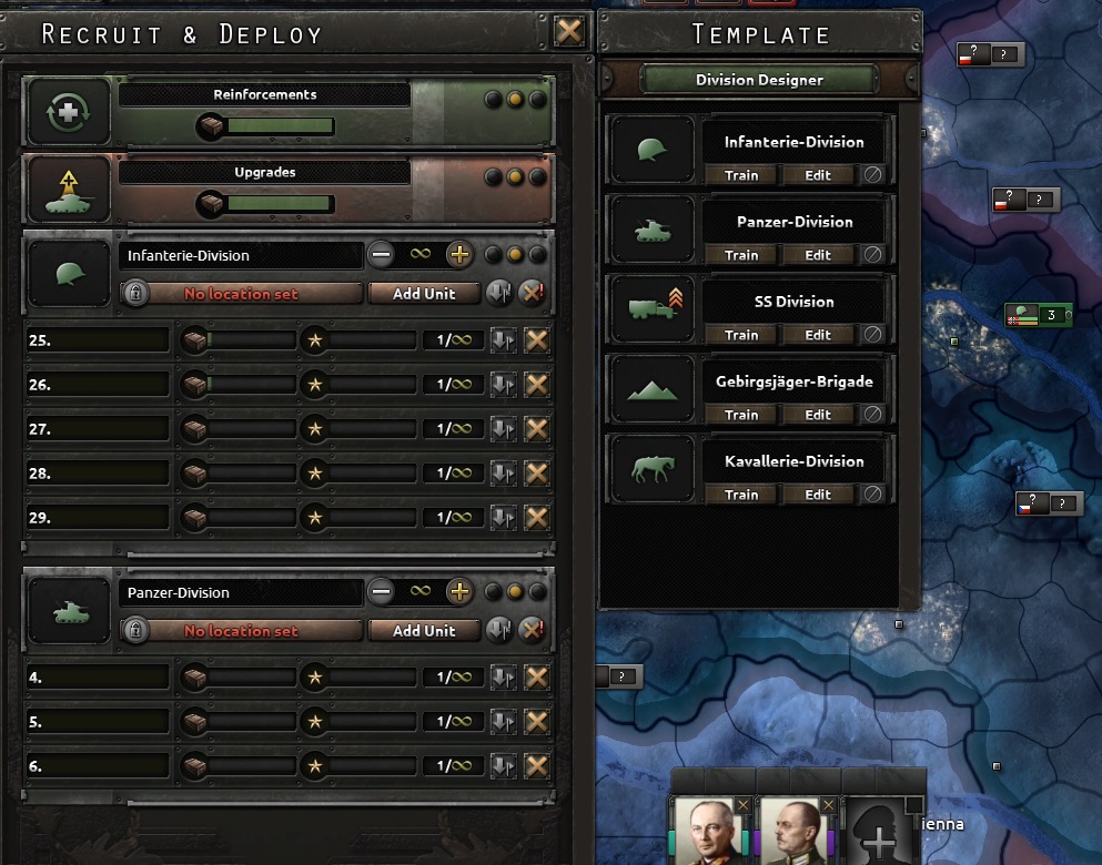 Divisions organized themselves by drawing from (1) the manpower pool, and (2) the equipment pool. Military factories must be directed to contribute to the equipment pool, which contains everything from rifles and uniforms to tanks and planes. Once a division reaches a minimum threshold for both men and equipment, it will begin basic training; once training completes, the division becomes available for deployment.