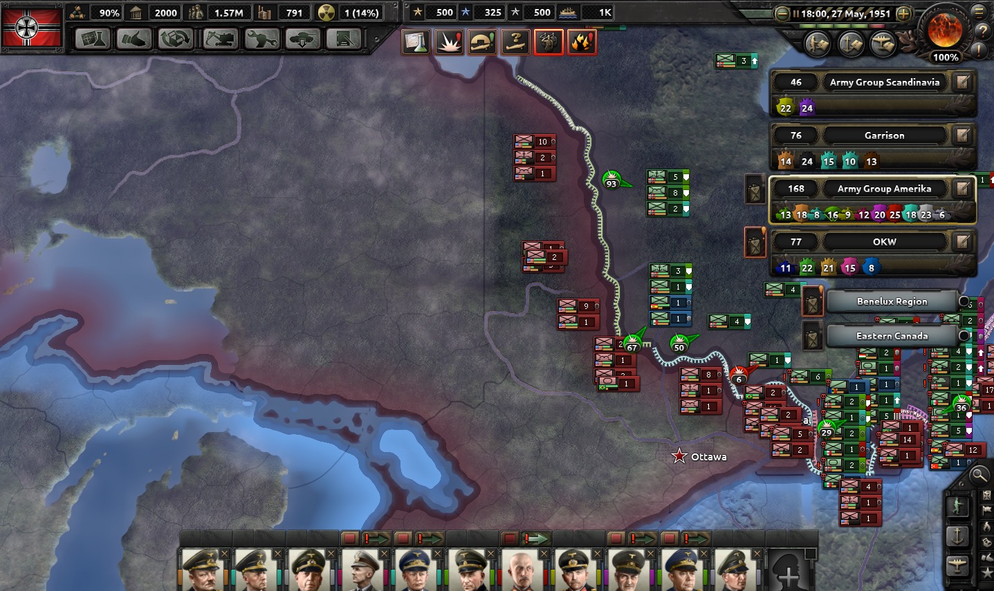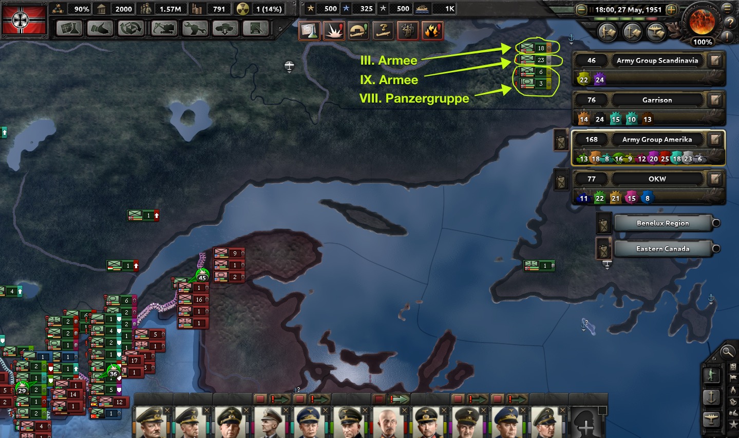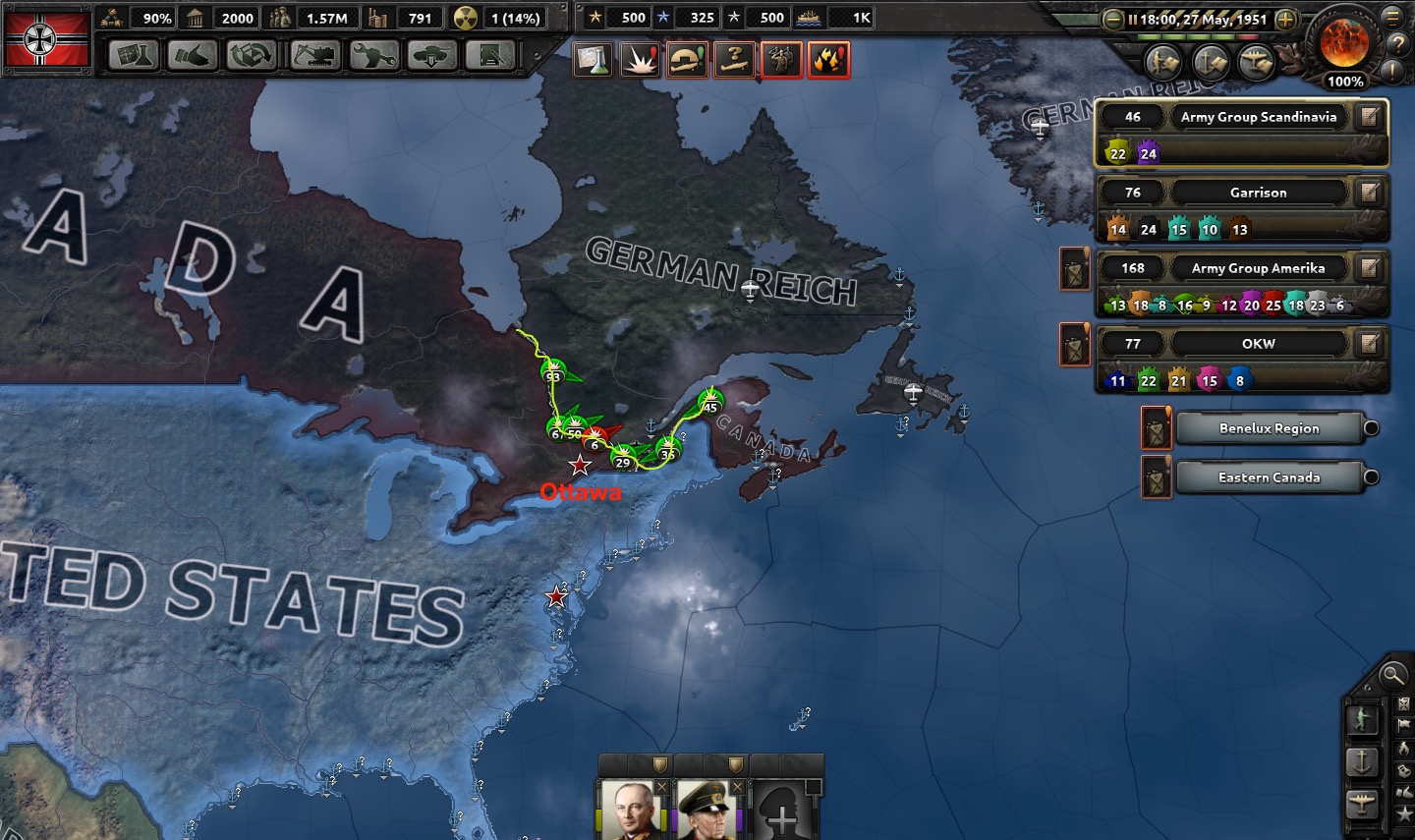 Near the end of the spring, OKW has completed large-scale improvements in harbor and rail networks in the Labrador area such that we can expand the beachhead. Army Group Amerika continues to operate as a single command, pushing the front southwest toward the initial jump-off points for Case Black. Three panzer groups are now in action pushing toward Montreal.