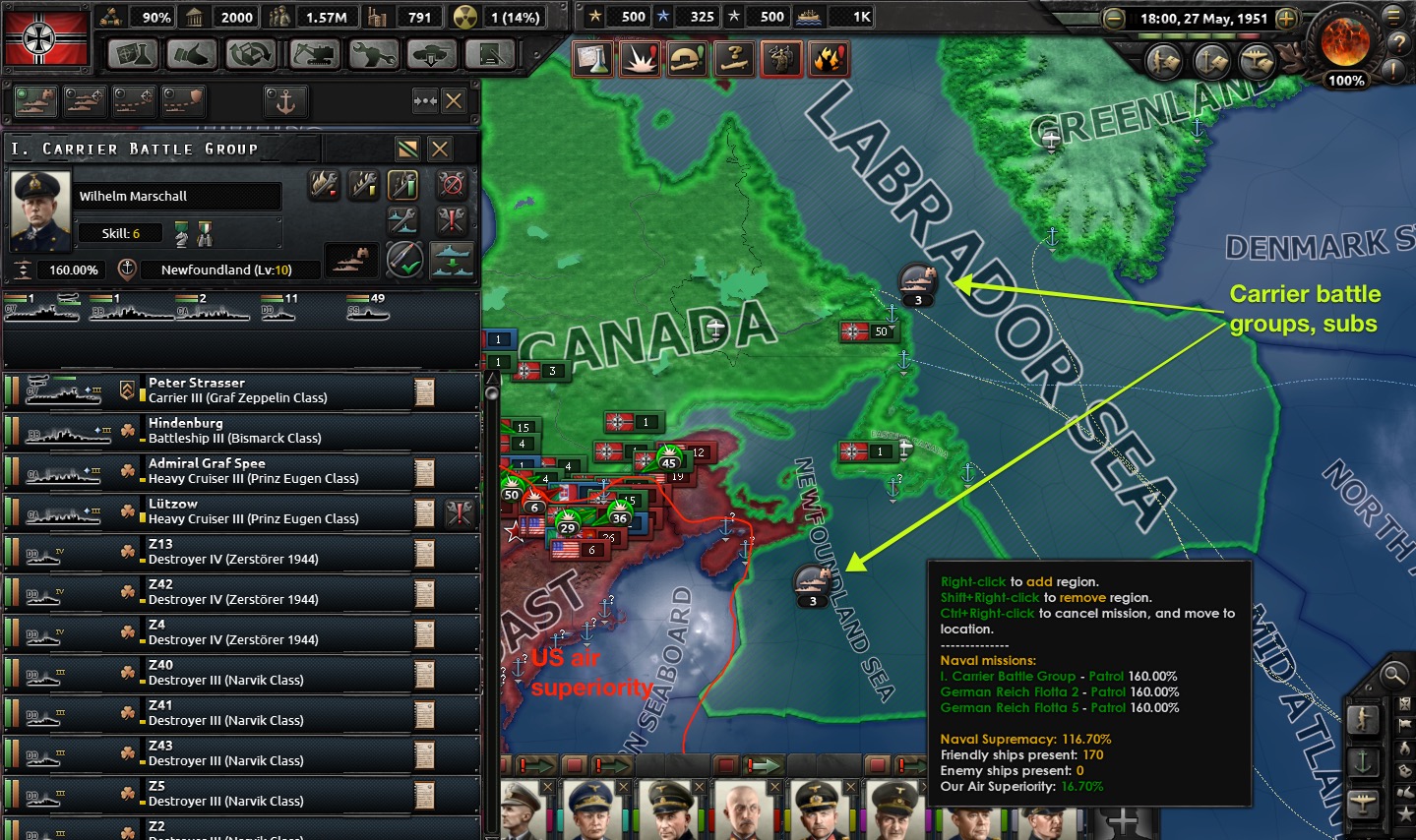 We already enjoy full naval superiority in the Atlantic and around the coastal areas we occupy in Canada, so these ships are not desperately needed at the moment. However we cannot approach the American east coast from the sea, as they have air bases everywhere and will punish us from the skies. The US now enjoys the same advantages we did during Sealion.