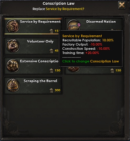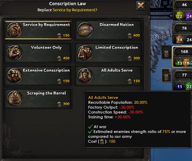 If things become desperate, we keep the move to an "all adults serve" policy in our back pocket -- bumping the recruitable-population percentage to 20%. However this brings with it substantial penalties in both industrial production and training time.