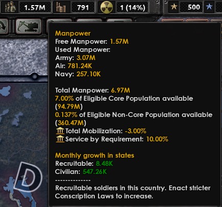 Notice that while the Reich has over 360 million service-eligible adults available in occupied territories, only a very small fraction of these people can be conscripted.