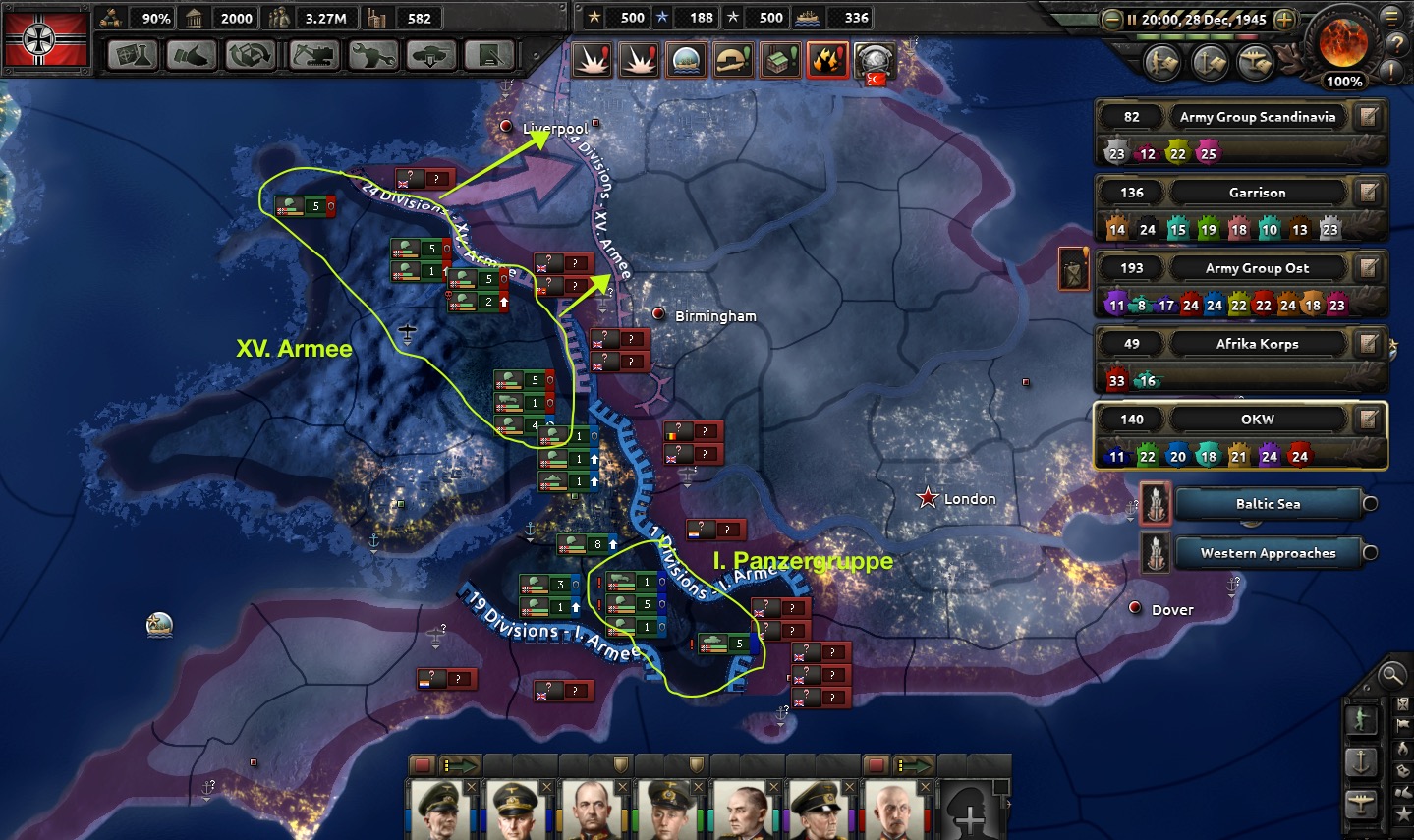 The infantry covers the front, threatening Birmingham to the east and Liverpool to the north; von Manstein prepares to strike out with 1st Panzer to the south and cut off Allied forces at Plymouth (in Cornwall).