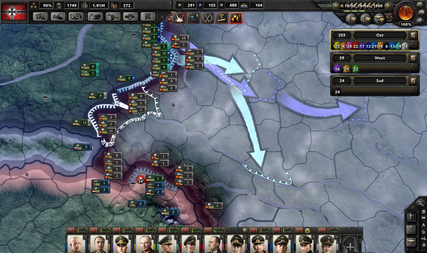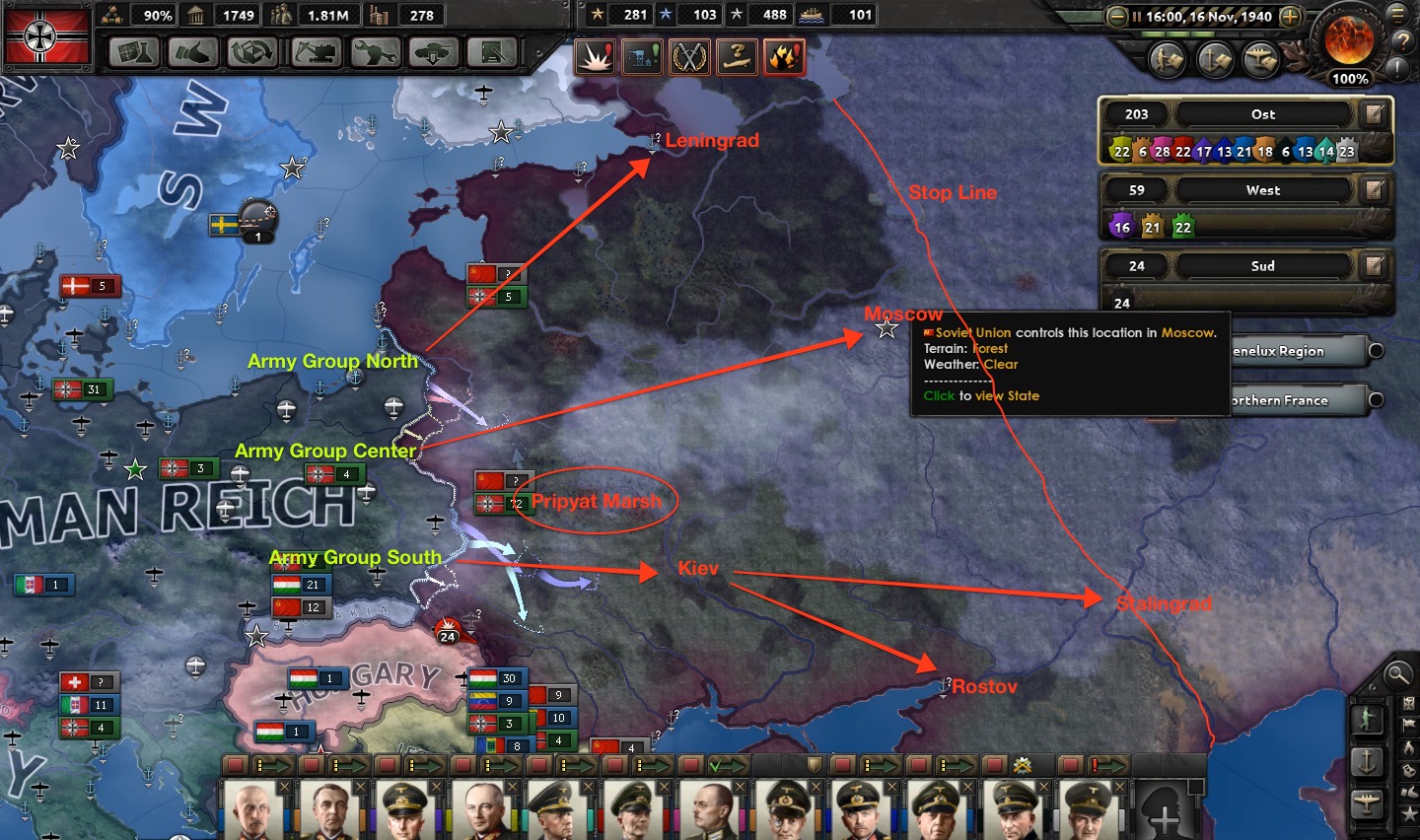We partition the Eastern theater ("Ost" as highlighted on the upper right-hand side of the screenshot) into three army groups: North, Center, and South. Each army group will follow an axis of advance toward a major political objective, although the goal remains the destruction of the Red Army, not the capture of cities. Army Group North advances toward Leningrad, the cradle of the Bolshevik Revolution; Center toward Moscow by way of Minsk; and South through Ukraine, capturing Kiev before moving into the Don Basin toward Rostov and Stalingrad.