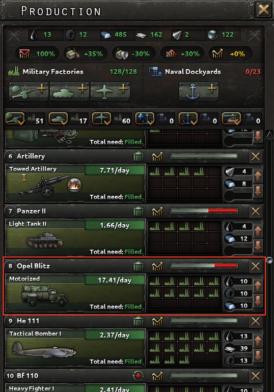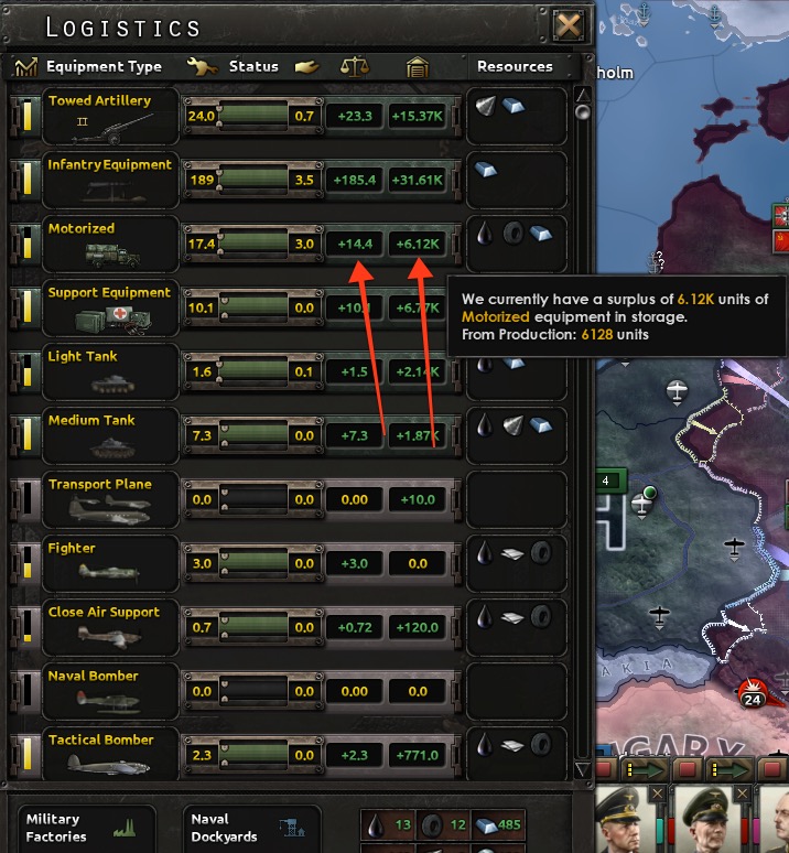 We currently produce 17.4 new trucks per day (losing 3 per day in field operations, for a net of 14.4), and maintain a reserve of 6.12K trucks in the motor pool (this does not include trucks already assigned to active divisions). The Reich relies on foreign imports for both oil and rubber for this production, and oil imports will be substantially reduced after Barbarossa begins because Russia is our largest foreign supplier.